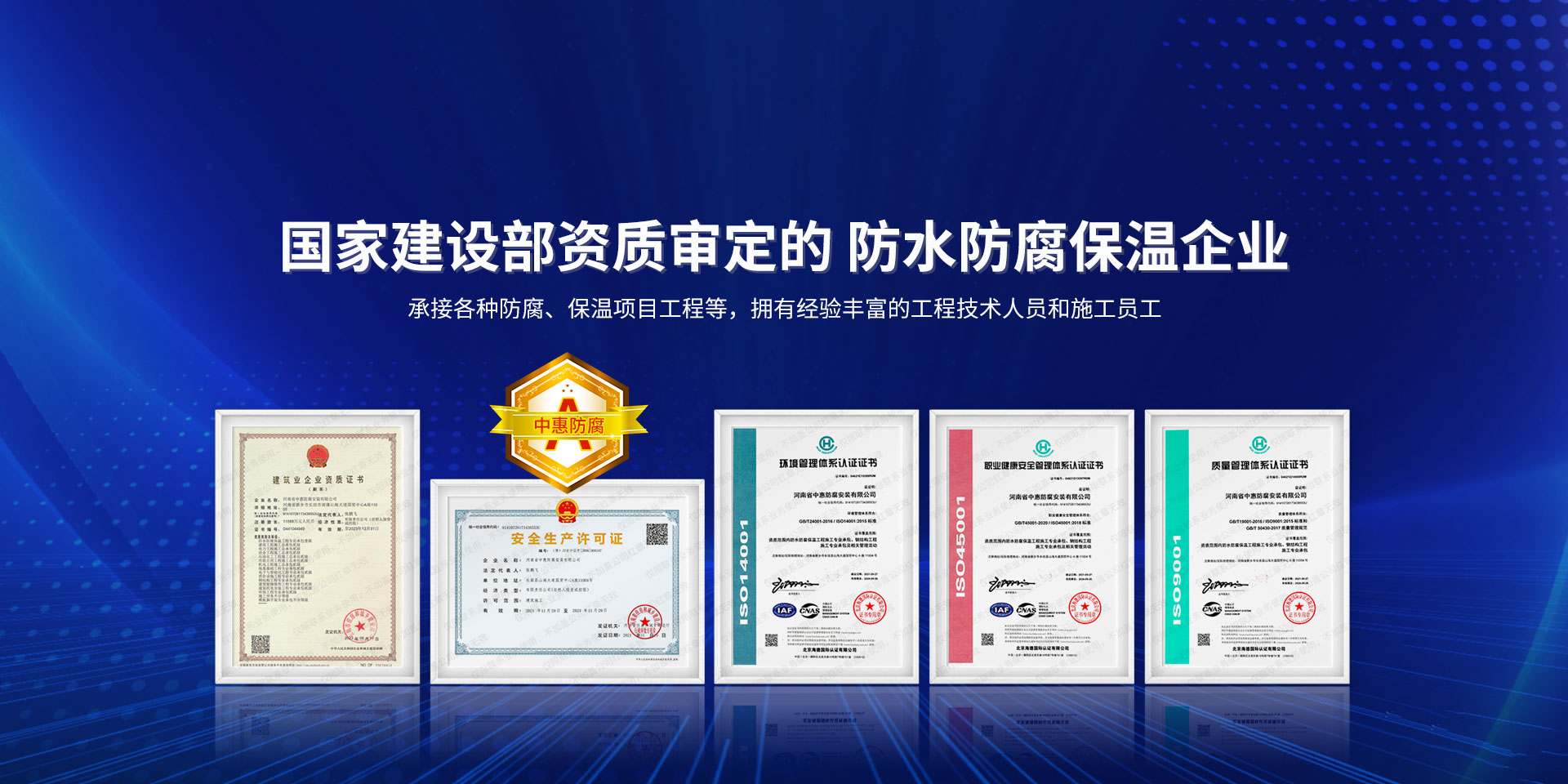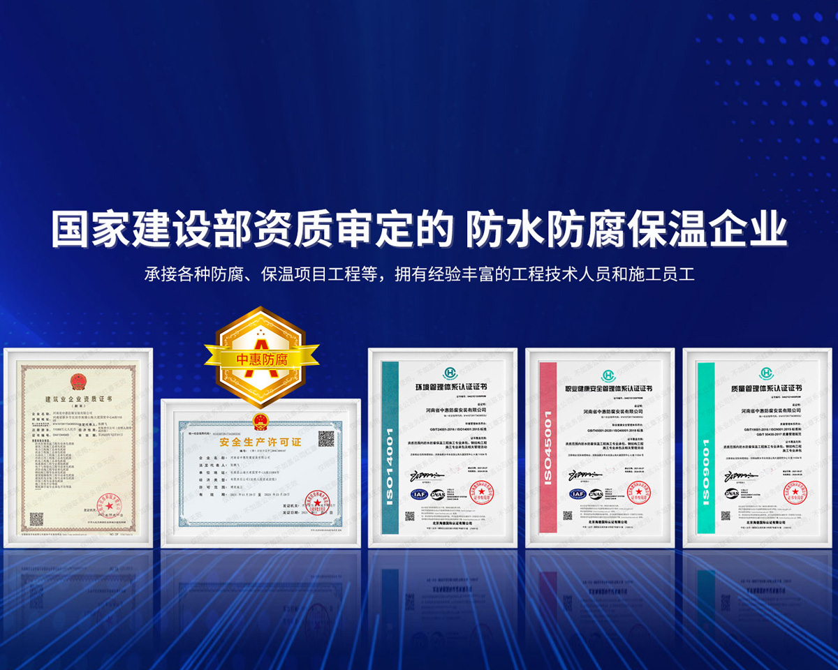 公司經營范圍:防水防腐保溫工程;消防設施工程;建筑裝修裝飾工程;建筑機電安裝工程;電力工程;建筑工程;石油化工工程;工業清洗工程;油罐清洗工程;鋼結構工程;環保工程;模板腳手架工程;電纜防火封堵、防污閃噴涂、外墻外保溫工程;各類施工勞務作業;設備維修、船舶鉚焊、涂裝;電力工程材料、建材、防水材料、防火材料、防腐保溫材料銷售,并相繼通過了GB/T19001-2008idtISO9001:2008GB/T50430-2007質量管理體系認證證書。GB/T24001-2004idtISO14001:2004環境管理體系認證證書。GB/T28001-2011idtOHSAS18001:2007職業健康安全管理體系認證證書。公司是中國防腐蝕于防護協會、中國施工企業管理協會、電力協會和中國鋼結構防水協會會員單位。 公司的經營業務涵蓋了石油、化工、電力、冶金、煤炭、船舶、國防、燃氣、水利、環保、交通運輸、航空及國防軍工和輕紡市政等行業的防腐保溫絕熱設備。鋼結構安裝、防火、防水、金屬噴鍍、聚脲噴繪、陰極保護、防滲透堵漏、玻璃鋼及各種磚版材料襯里、橡膠襯里、煙氣硫和耐酸溶劑腐蝕等工程施工。公司連續十年榮獲“省市先進施工企業”“安全生產先進單位”“重合同,守信用企業”和“AA***資質企業”的稱號。2000年被命名為市級文明單位,2002年被國家工商行政管理局命名為“重合同,守信用的企業”、被中國工業防腐蝕技術協會命名為“防腐蝕企業,能源節約及環境保護領域有豐富的經驗和***的業績。工程一次交驗合格率100%。其中攀枝花鋼鐵公司煉鐵廠四號高爐及熱風爐防腐工程、上海寶鋼公司煤氣柜防腐工程、撫順石油一廠裝置防腐項目、齊魯石化公司稀烴廠高塔防腐工程、吉林化學工業公司煉油廠油罐防腐工程、天津石化熱電廠六號爐頂棚聯絡管保溫工程、大慶油田(太倉)力神泵業工程、中國化學工程第十一建設工程、中原油田勘探局工程、中國石化銷售有限公司華北分部、魯皖輸油管道工程、貴州開磷息烽合成氨工程、陜西黃陵煤化工程、中國石油天然氣西部管道塔里木輸油工程、邯鋼集團邯寶鋼鐵公司煉鐵工程、德州供電工程、吉寶(南通)船廠工程,偃師華潤熱力工程、鄭州熱力總公司。 河南省中惠防腐安裝有限公司愿以豐富的施工經驗,***的技術,***的設備,***的管理,***的服務,竭誠為國內外廣大的用戶提供***滿意、******的工程作品。 我公司愿與國內外同仁一道,團結協作,共同推進防腐蝕行業發展! 公司地址:河南省長垣縣建設路北段360號 固定電話:0373-8866488 郵編:453400 網址:http://www_zhff_com_cn.zyzwgzs.com